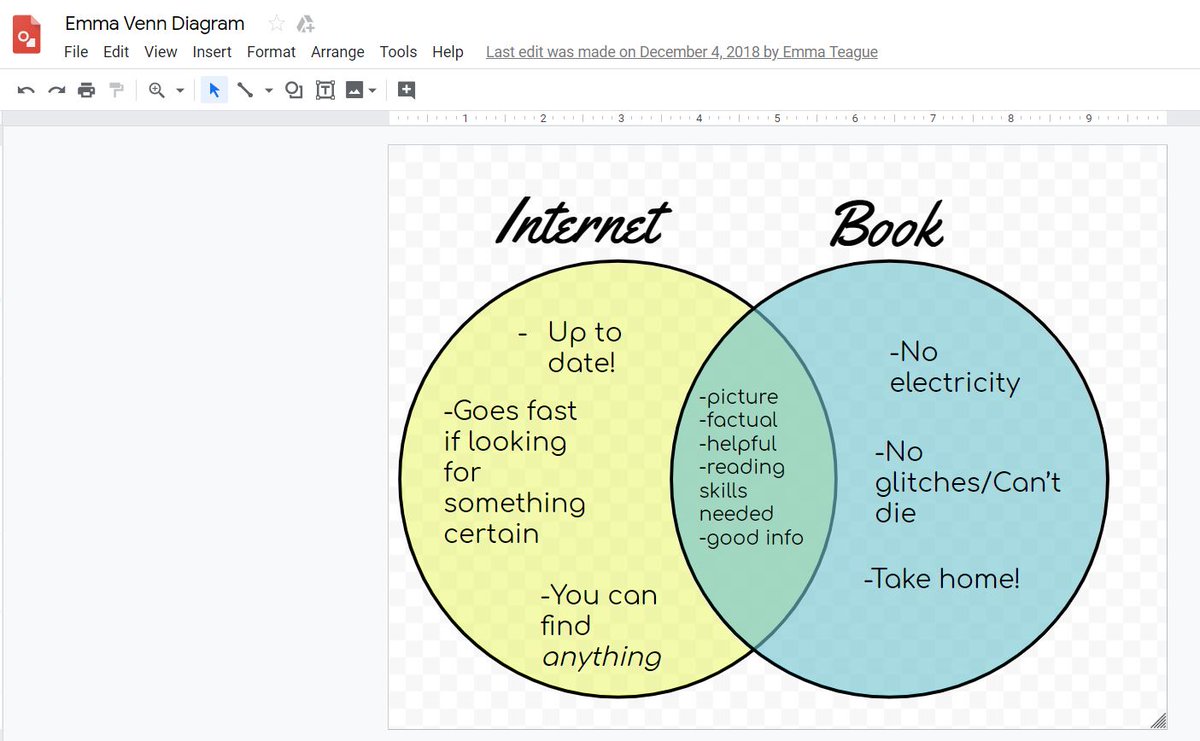 Choose your Venn diagram from the list in the right-hand sidebar. Click "+." A preview of your selection will pop up. Click "Insert." If you make any changes to your Venn diagram, make sure to update it on the Google Doc. Select Add-ons > Lucidchart Diagrams > Updated Inserted Diagrams. How to create a new diagram in Google Docs with the add-on The steps are quite similar like the Google docs, except few changes. Check it out! How to Make a Venn Diagram On Google Slides. Making Venn diagram on Google docs and slides are very easy once you understand the step-by-step guide regarding the same. Open the Google slides and select the blank slide. Note: To make a Venn diagram on Google ... I just made two for my google classroom. Using google docs to create a live interactive venn using google docs to create a live interactive venn diagram for moodle february 10 2012 at 6 35 pm 4 ments hi all i used this trick in a how to make a venn diagram in. Open the google slides and select the blank slide.