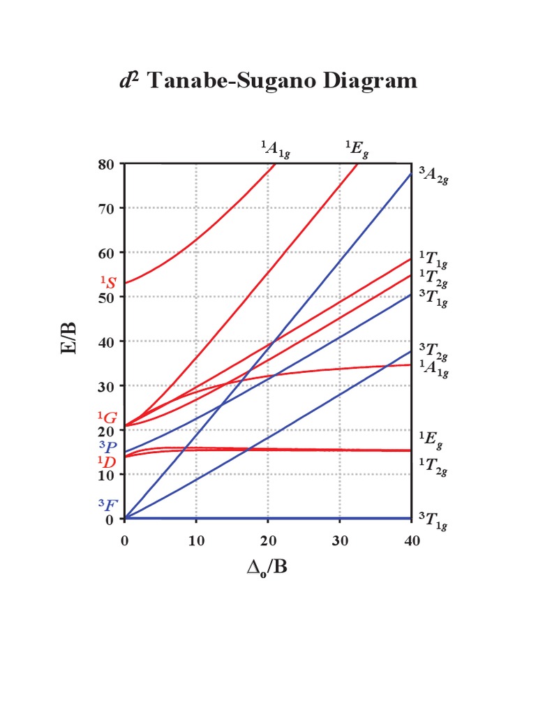 Tanabe-Sugano diagrams for d4, d5, d6, d7 have a vertical line down the middle, separating high-spin (low field) cases on the left, and low-.29 pages English: The Tanabe–Sugano diagram for a d 7 transition metal ion. The energies are calculated using a Racah C = 4.5 B, and only selected states are depicted. The multiplicity of the ground state switches from a quartet to a doublet at the vertical line. Thick solid lines show states sharing a multiplicity with the ground state. Lecture 4 May 11: Tanabe Sugano Diagrams A Tanabe-Sugano (TS) diagram plots the energy dependence of the various ligand field states (or terms) with field strength. The strength of the ligand field is defined by Dq, which is related to the octahedral crystal field splitting by 10Dq = ∆o. The energy of the state is given by E.