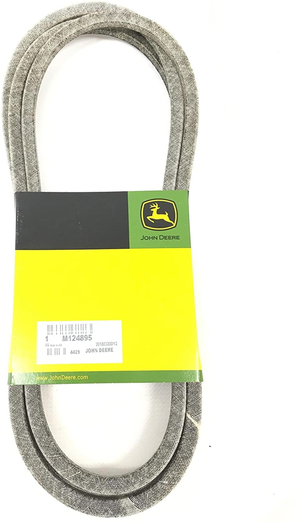 Specs: OEM replacement belt, belt application deck, belt type covered, length 115 1/2 in., width 1/2 in., packaging type branded sleeve; Replaces OEM number: John Deere M124895; Fits: John Deere Scotts S1742 and S1642, Sabre 1542HS, 1542GS, 1642HS, 1742HS and 1742GS with 42 in. deck