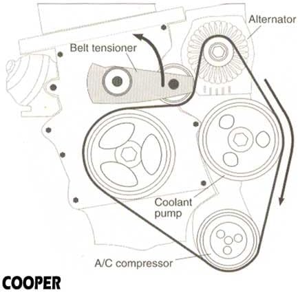 This diagram shows the components driven by the serpentine belt on a typical MINI Cooper four-cylinder engine. Green Arrow - Alternator , Yellow Arrow - Water Pump, Purple Arrow - A/C Compressor, Red Arrow - Main Crankshaft Pulley, Blue Arrow - Tensioner for the serpentine belt (R50 MINI Cooper) Serpentine Belt Replacement. Here's some short instructions on this very basic of maintenance tasks. ... R52 MINI Cooper Convertible (2005-2008) - R52 MINI Cooper S Convertible (2005-2008) - MINI Cooper (2007-11), MINI Cooper S (2007-11) Electrical: Wiper Motor and Transmission Replacing. See how to replace the wiper motor and transmission in ... MiniSurvivor: Comments: Changed my belt on my 2010 mini and ended up moving the crankshaft pulley independent of the others, now it drives fine but there is a loud, metallic 'ting, ting, ting' when I drive.The noise keeps pace with acceleration. August 2, 2021 : Followup from the Pelican Staff: Check if one of the pulleys is hitting or rubbing. Moving the pulley with the drive belt off is OK.