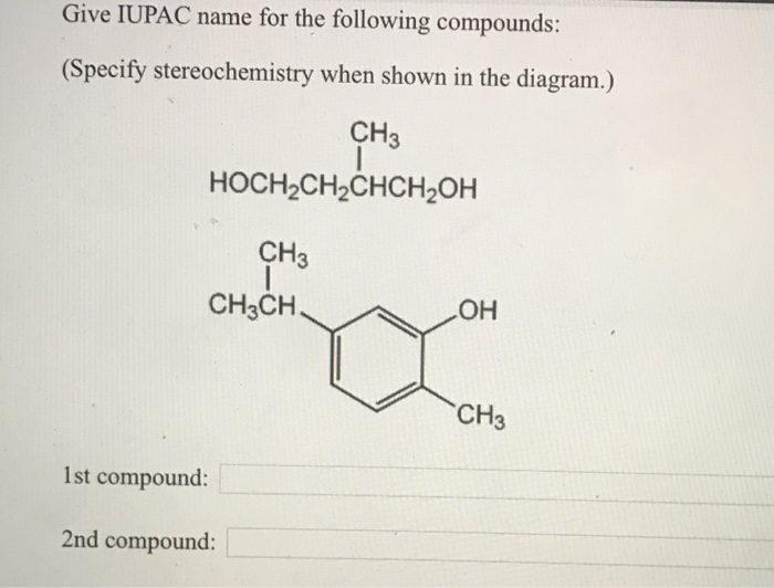 What is the IUPAC name for the compound shown below? ... Name the following compound shown in its Newman projection. ... For the substituted cyclohexane compound given below, highlight the substituents - by clicking on atoms - that will interact with the methyl group in a 1,3-diaxial fashion after rotation to the other chair conformation. ... Solved Give IUPAC name for the following compounds: (Specify | Chegg.com. Science. Chemistry. Chemistry questions and answers. Give IUPAC name for the following compounds: (Specify stereochemistry when shown in the diagram.) CH HOCH2CH2CHCH2OH CH CH3CH OH CH 1st compound: 2nd compound: