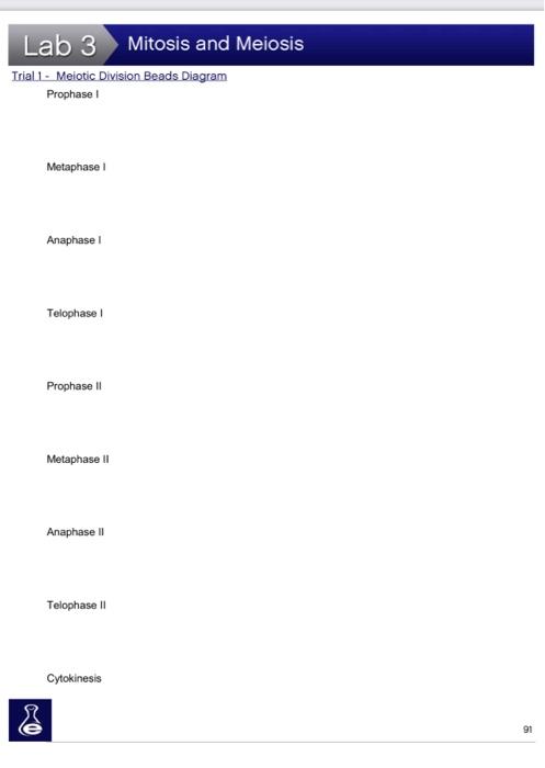 Transcribed image text: Data She experi Lab 12 > Experiment 1 Data Sheet dels TRIAL 2 - MEIOTIC DIVISION BEAD DIAGRAMS: Prophase : LE Metaphase 1: Anaphase 1: Telophase 1: Prophase II: Metaphase II: Anaphase II: Telophase II: Cytokinesis: Data SheeExperia Lab 12 Experiment 1 Data Sheet TRIAL 2 - MEIOTIC DIVISION BEAD DIAGRAMS: Prophase 1 ...