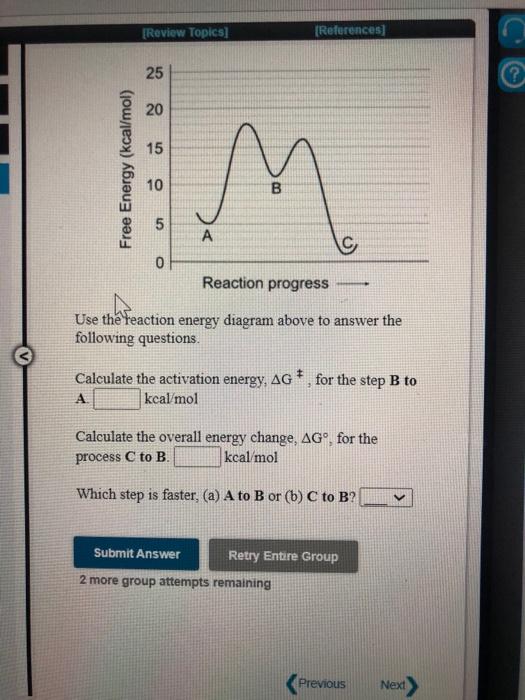Answer to 25 Free Energy (kcal/mol) 20 15 10 B A C D O Reaction progress Use the reaction energy diagram above to answer the following questions.1 answer · Top answer: See explanation. DeltaG=Gproduct-Greactant Use the reaction energy diagram above to answer the following questions. Calculate the activation energy, ?G, for the step D to C. ______ kcal/mol.1 answer · Top answer: Faster...