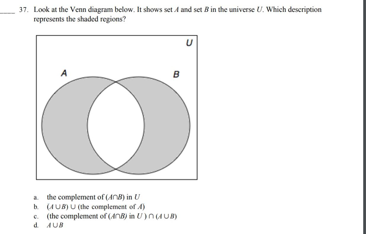 Sets. A set is a collection of things. For example, the items you wear is a set: these include hat, shirt, jacket, pants, and so on. We can show the Universal Set in a Venn Diagram by putting a box around the whole thing: Now you can see ALL your ten best friends, neatly sorted into what sport they play (or... 17.6.2021 · Venn diagram is also known as Logic diagram or set diagram. We use circles to represent sets that can be intersecting or overlapping or non-intersecting, based on relationship between them. There are a number of operations we can perform using Venn diagram, but the major among them are: Union, Intersection, and Complement. Venn Diagrams: Venn diagrams of Set Operations. In the set theory, there are various operations performed on sets like Venn Diagrams: Complement of Union of sets. (A ∪ B)': this is read as the complement of A union B. This represents elements that are neither in set A nor in set B. A Venn diagram represents a set as the interior of a circle. Often two or more circles are enclosed in a rectangle where the rectangle represents the We will use Venn diagrams to solve this problem. Let the set A represent those car enthusiasts who drove cars with automatic transmissions, and set S...