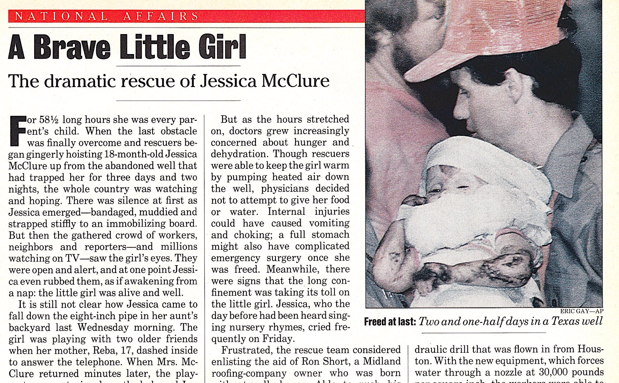 Baby Jessica Rescued from the Well: 30 Years Later | Time One of those weeks was 30 years ago, when 18-month-old Jessica McClure, nicknamed "Baby Jessica," fell into a well in Midland, Texas, on Oct. 14, 1987. She had gotten trapped in a dogleg in the...