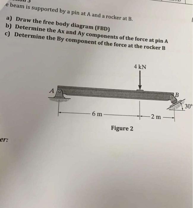 Solved Draw the free body diagram for the beam. A is a pin ... Question: Draw the free body diagram for the beam. A is a pin and B is a rocker. Draw the vectors starting at the black dots. The location and orientation of the vectors will be graded. The length of the vectors will not be graded. This problem has been solved! See the answer Draw the free body diagram for the beam. A is a pin and B is a rocker.
